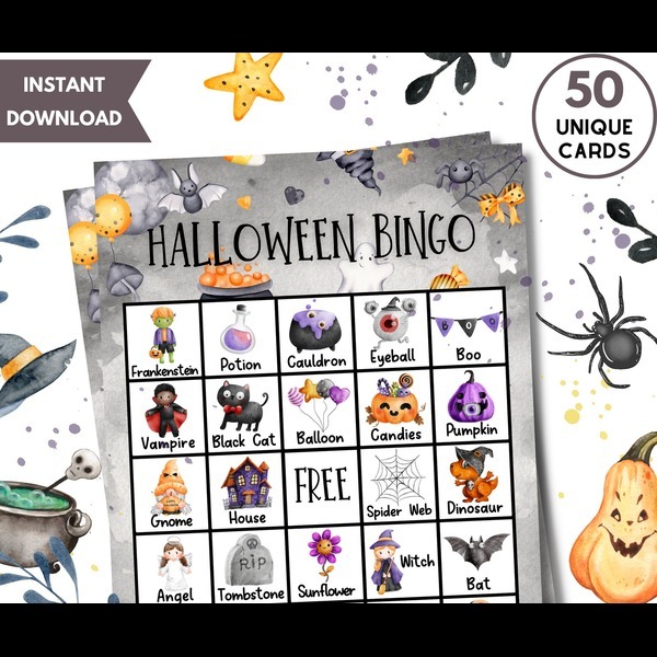 🎃 Printable Halloween Bingo – 50 Unique Cards w/ Labels | Fun Halloween Activity for Kids, Teens & Adults