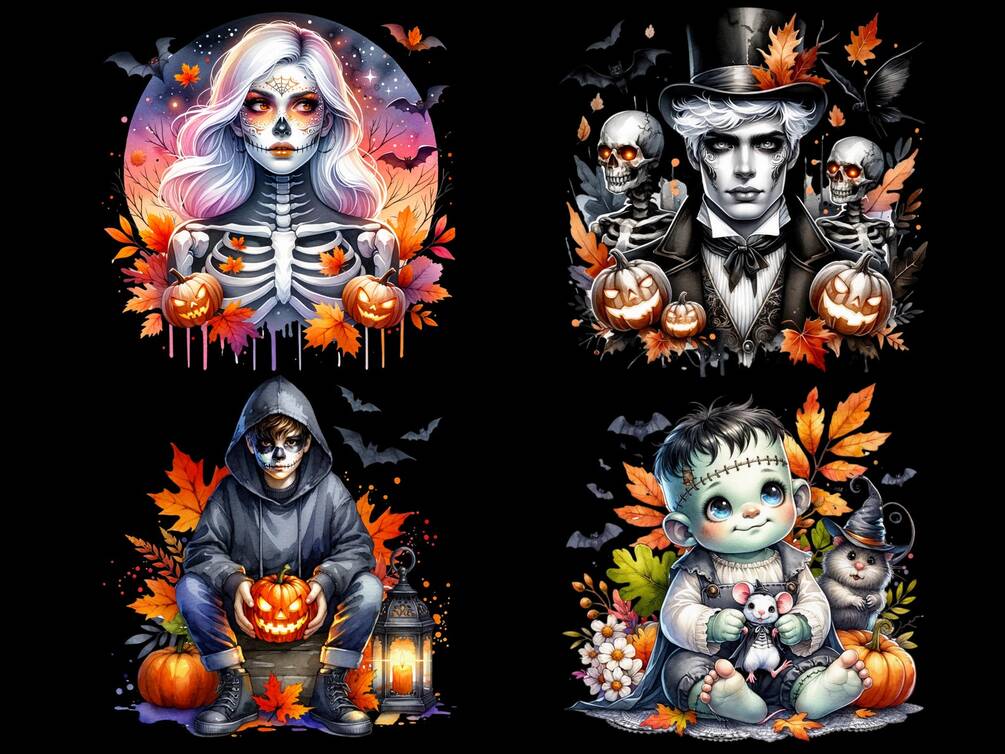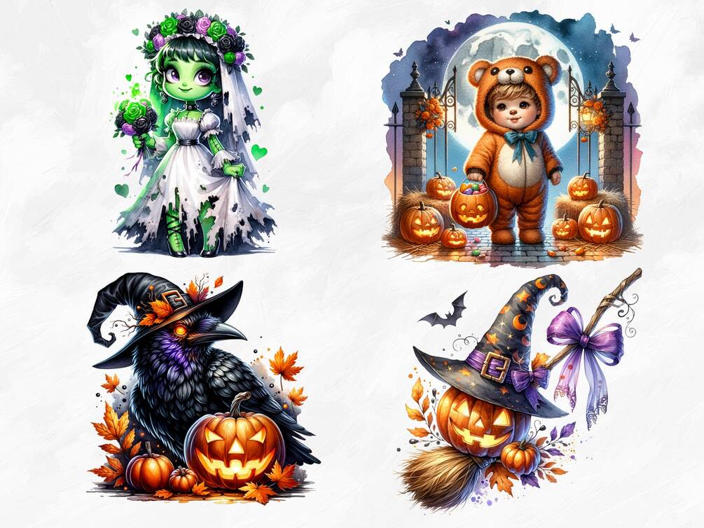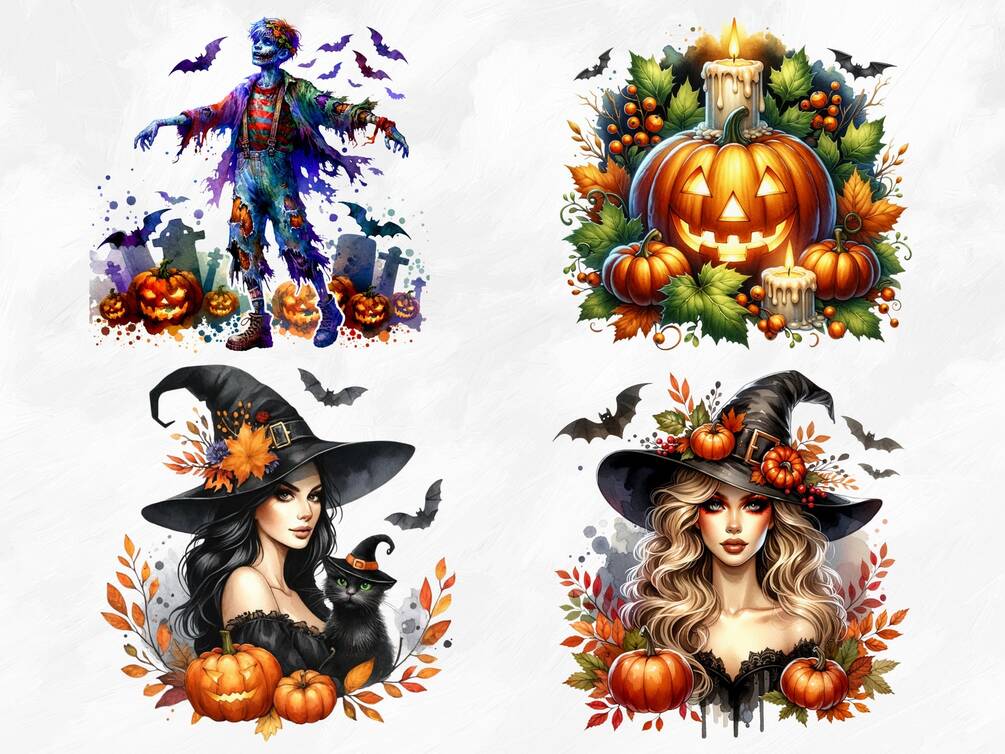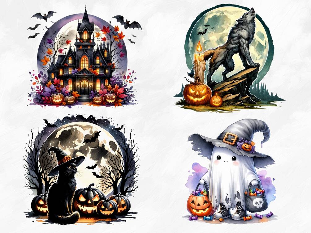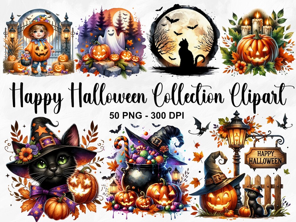 Watercolor Halloween Clipart Bundle – 50 PNG spooky graphics (ghosts, cats, witches, pumpkins, spiders). High-resolution 300 DPI, commercial use allowed. Perfect for cards, mugs, stickers, party decor & more. Instant digital download.
