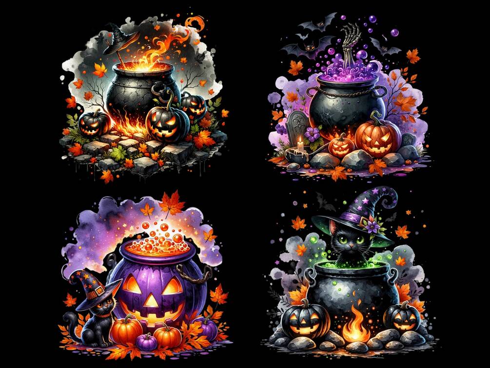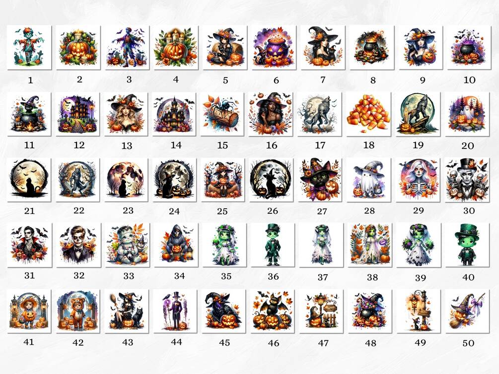This bundle includes 50 high-quality PNG images (300 DPI, transparent background, 12x12 in.) featuring ghosts, witches, jack-o-lanterns, spiders, black cats, and more — perfect for Halloween-themed projects.