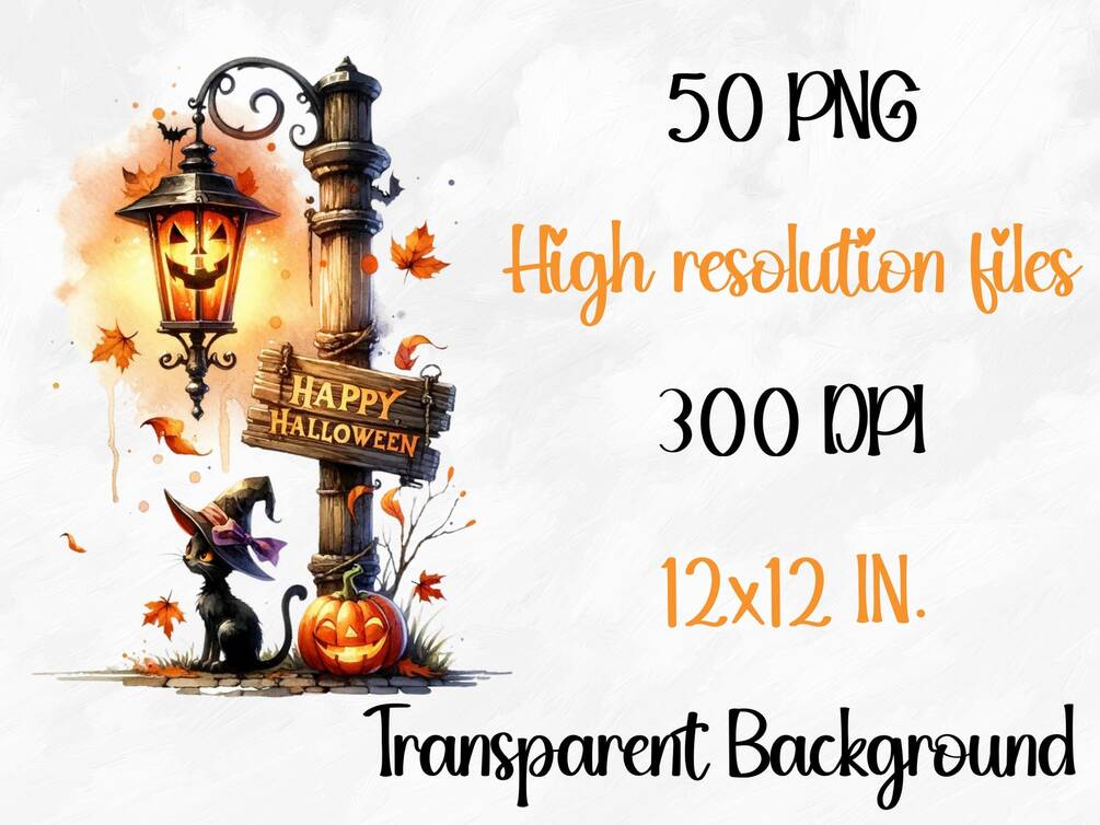 Watercolor Halloween Clipart Bundle | 50 PNG Ghost, Witch, Cat, Jack-O-Lantern | Commercial Use